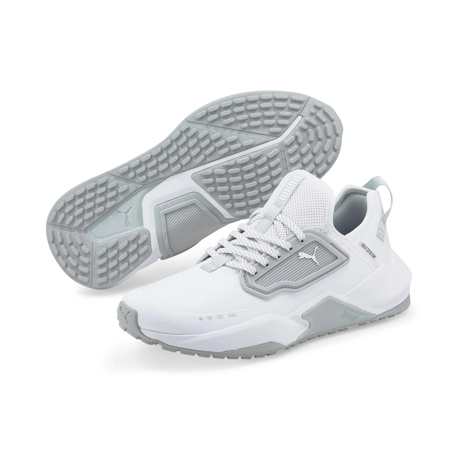 Made for those who get their steps in on the course, the Puma GS-ONE Golf Shoes live up to their performance in a running-shoe-inspired silhouette. Spikeless outsole ensures incredible grip on every drive and saddle system technology provides a no-slip fit for a comfortable feel you can take off the course.Â
