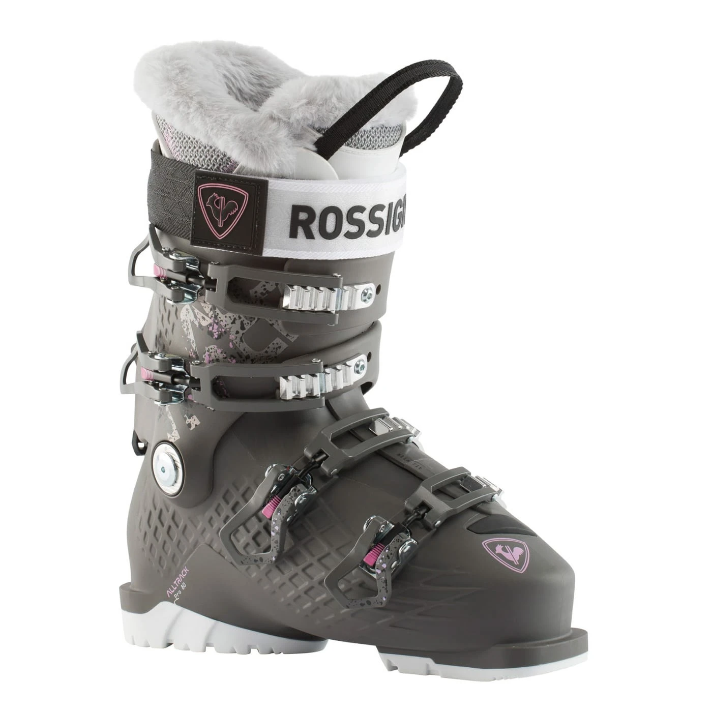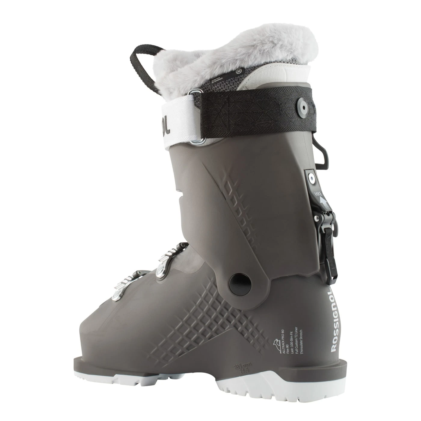The Rossignol Alltrack Pro 80 W ski boots give advanced-intermediate skiers touring style boot comfort in an easy-to-love package that skis with authority and walks like a dream. Rossignol uses top Dual Core technology and a Full Custom T3 liner in the Alltrack Pro 80, along with Thinsulate™ Stretch insulation for toasty feet. A softer plastic insert molded over the instep area, allowing easier opening of the boot overlap for more comfortable entry and exit. The height of the cuff is significantly lower than for a unisex cuff. The tulip-shaped rear section easily accommodates a women’s natural calf shape. The Alltrack Pro 80 women’s boot is legendary among experienced all mountain skiers.